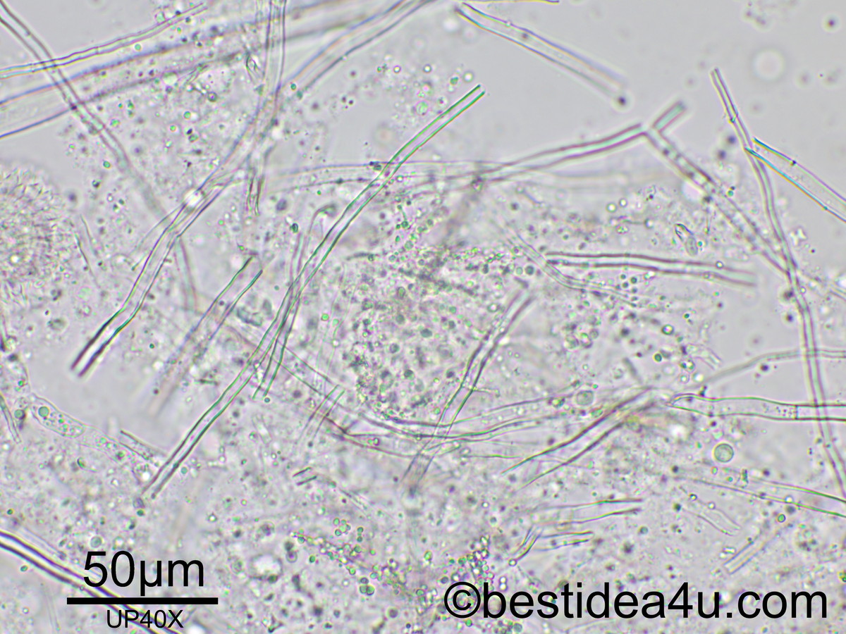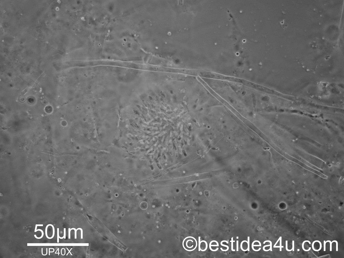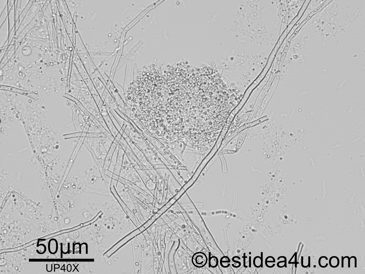 菌糸だけでなく、無数の胞子(分生子)の存在も確認できます。