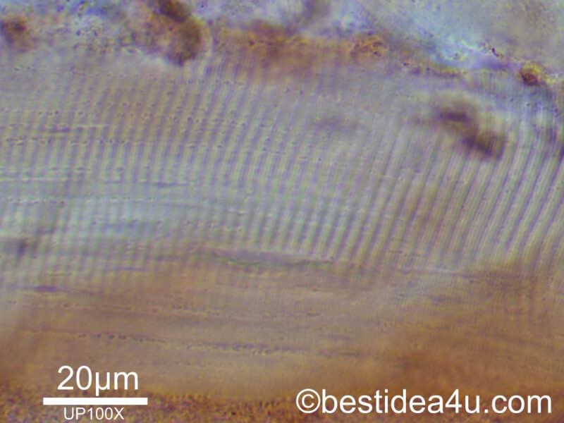 40倍の対物レンズを使うと縞模様がはっきりと見えてきました。観察場所を変えてみます。