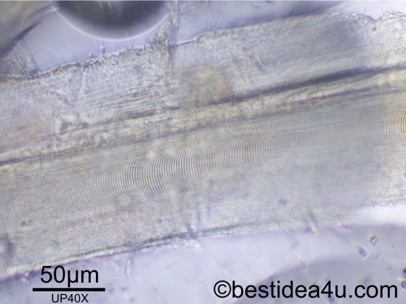 場所を変えても縞模様がはっきりと確認できます。対物10倍で見えていたすべての繊維状のサンプルに、縞模様があることがわかりました。カツオは、広い海を常に泳ぎ続ける必要があり、身の大部分が筋肉で構成されているようです。