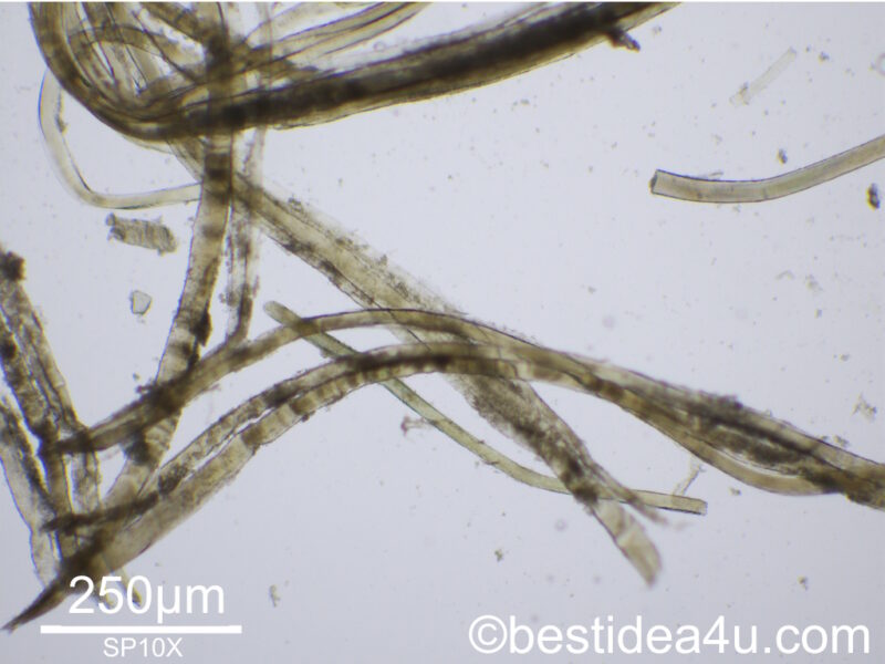 ある程度ほぐれたら、スポイドで水を1滴たらし、カバーガラスをかけて低倍から観察していきます。