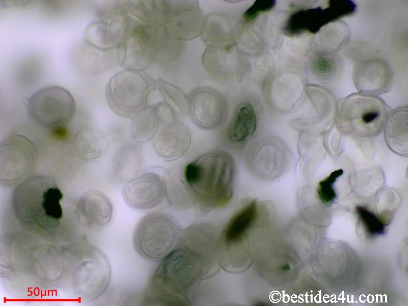 スギ花粉(600倍)生理食塩水に浸漬直後。花粉が割れ欠けている。