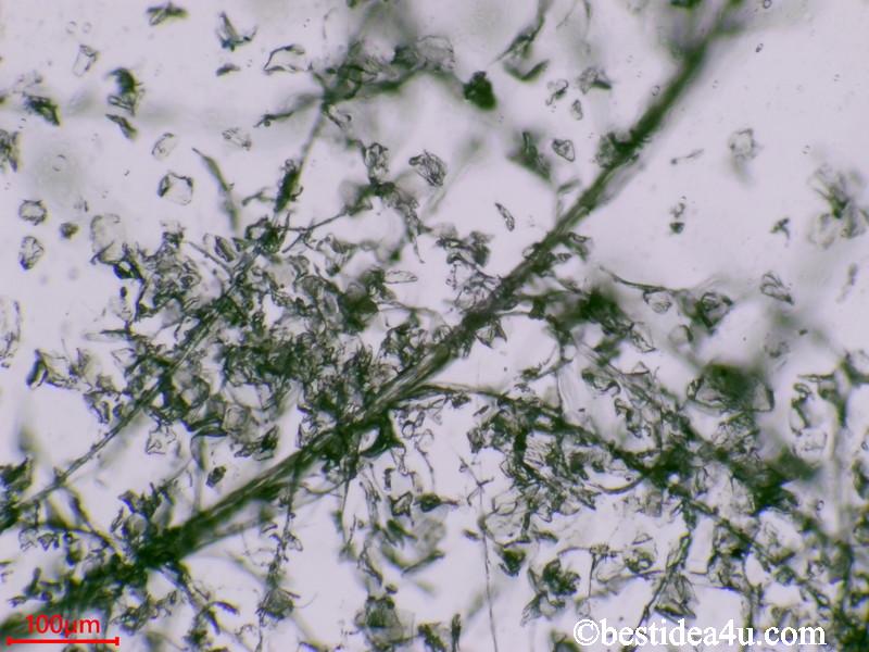 上の顕微鏡写真でも、繊維のまわりにより小さなゴミのようなものがたくさん付着しているのがわかりますね!