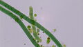 全体的に見て繊維状物質が多い印象です。不定形の粒子状物質も多数含まれています。もう少し拡大してみましょう。